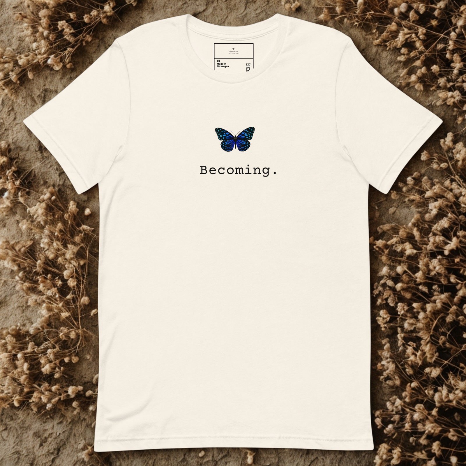The Becoming Tee is a quiet celebration of transformation. With a delicate, deep-toned butterfly and the simple word “Becoming.” beneath it, this design honors the beautiful, messy, and necessary journey of becoming who you’re meant to be.
