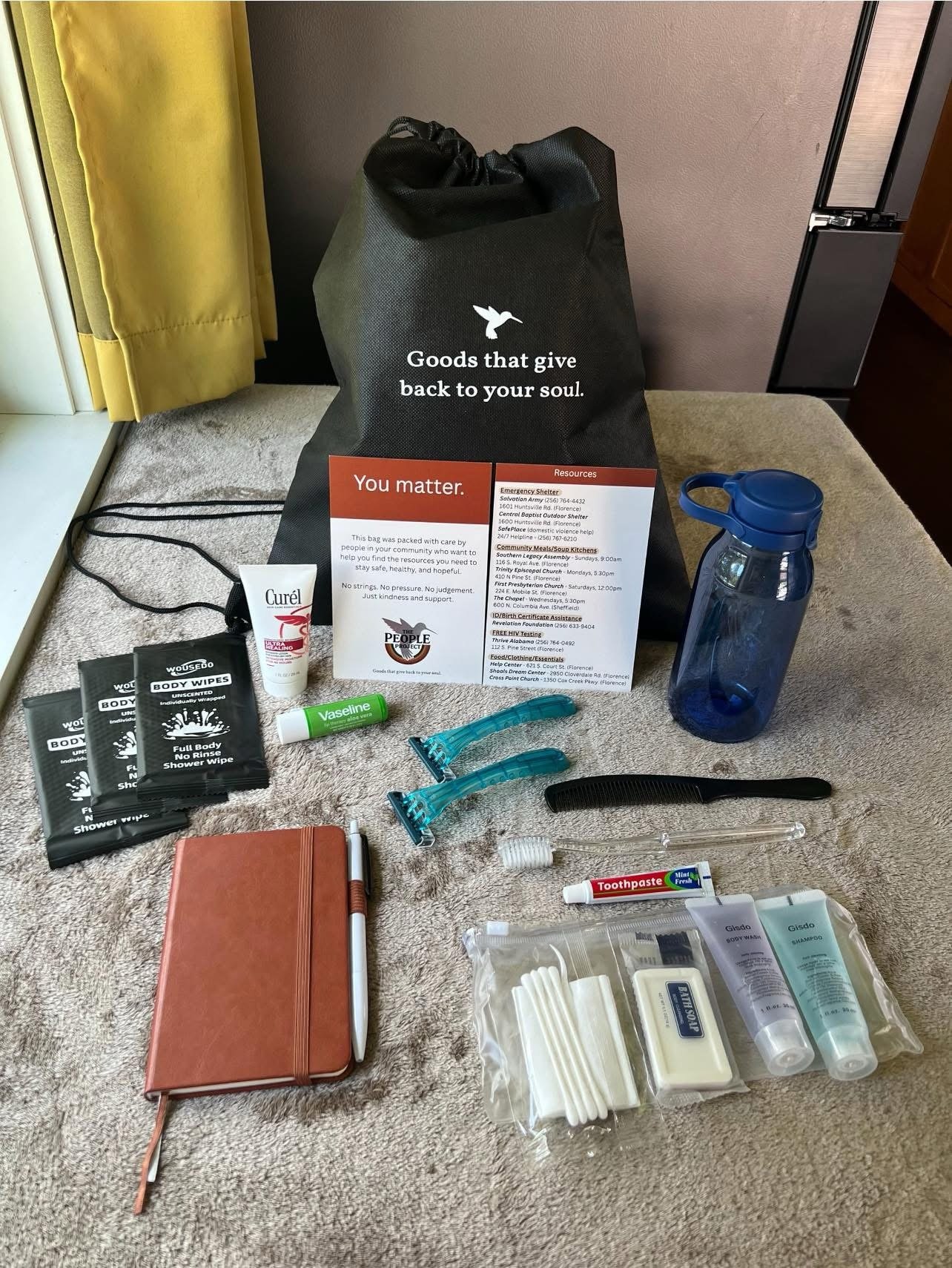 Home Free Care Kits are thoughtfully assembled care packages created to support individuals experiencing homelessness. Each kit includes personal hygiene items, grooming essentials, water bottle, a journal, and a printed resource card with local shelter and support information. These kits are built with dignity in mind—offering not just items, but encouragement and connection.